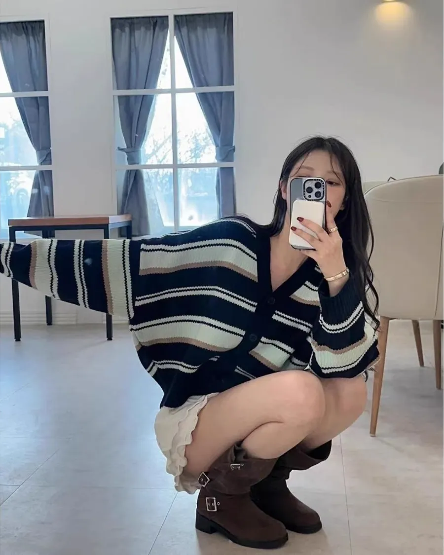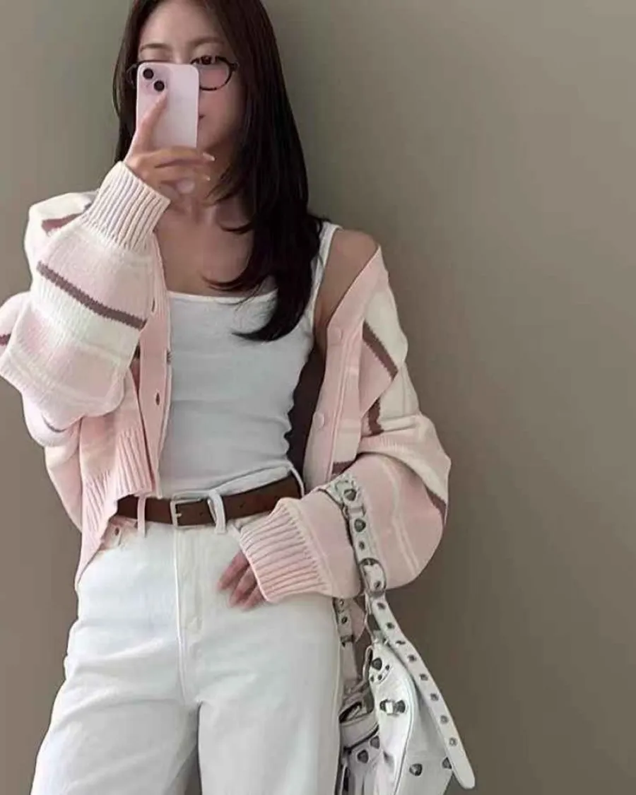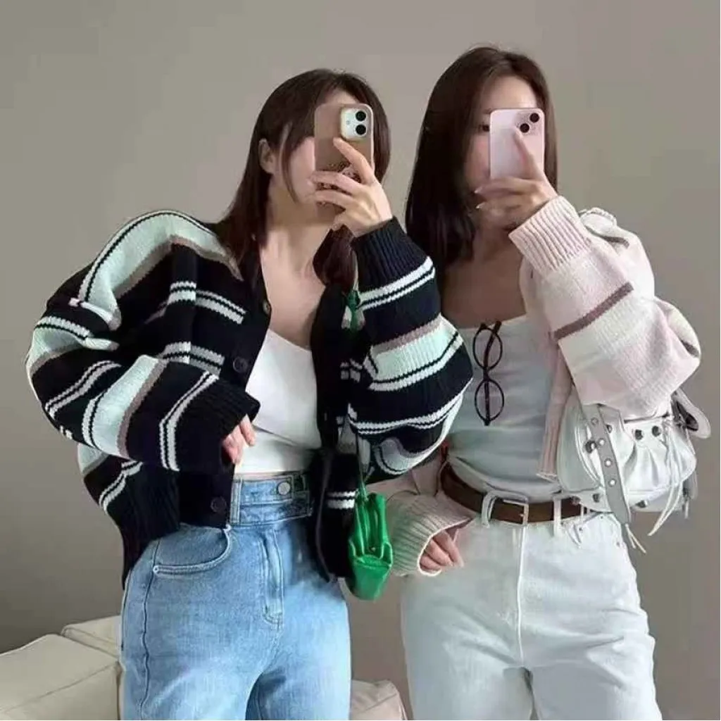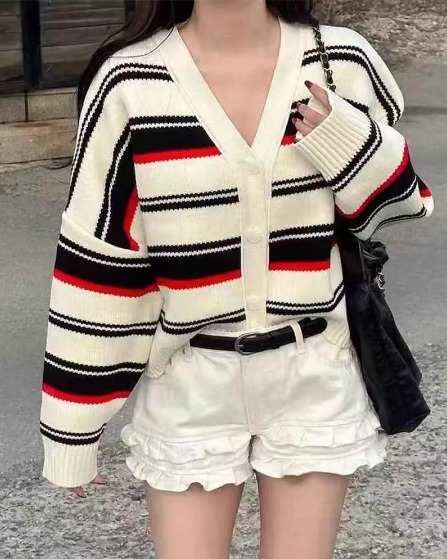 正韓V領條紋撞色開衫外套