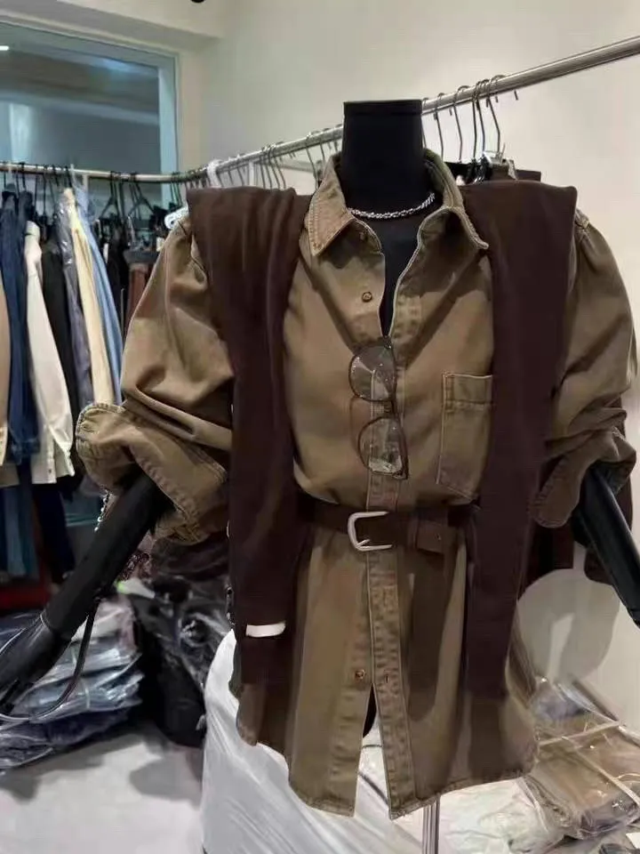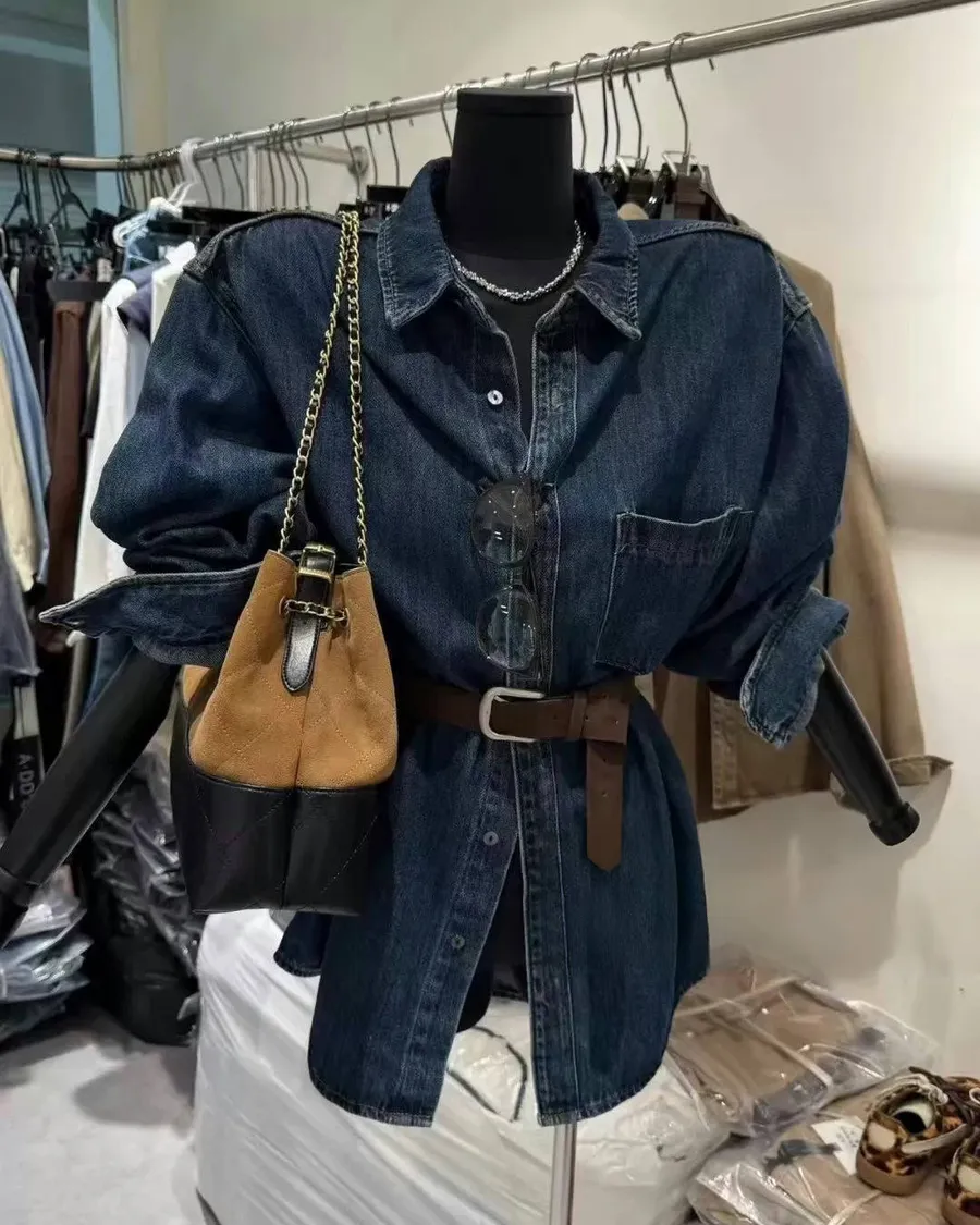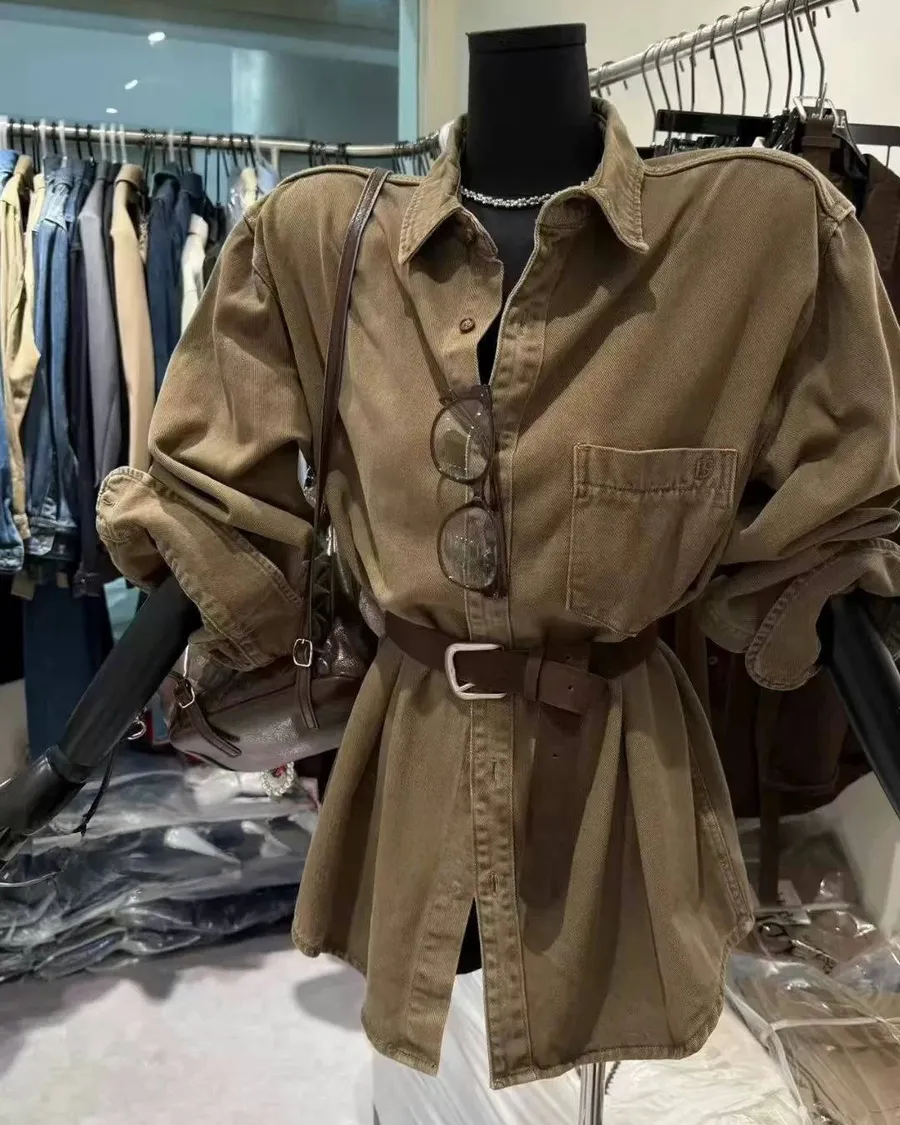 百搭顯瘦長袖牛仔襯衫上衣附腰帶