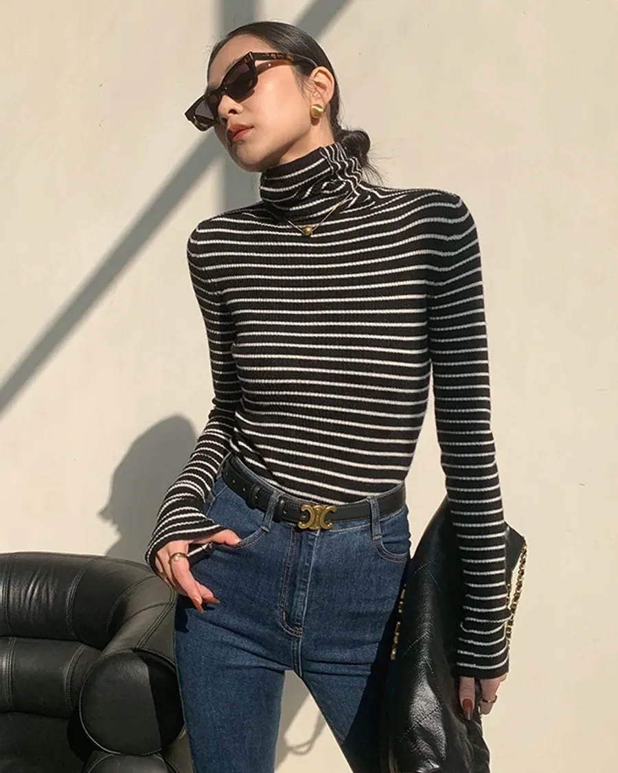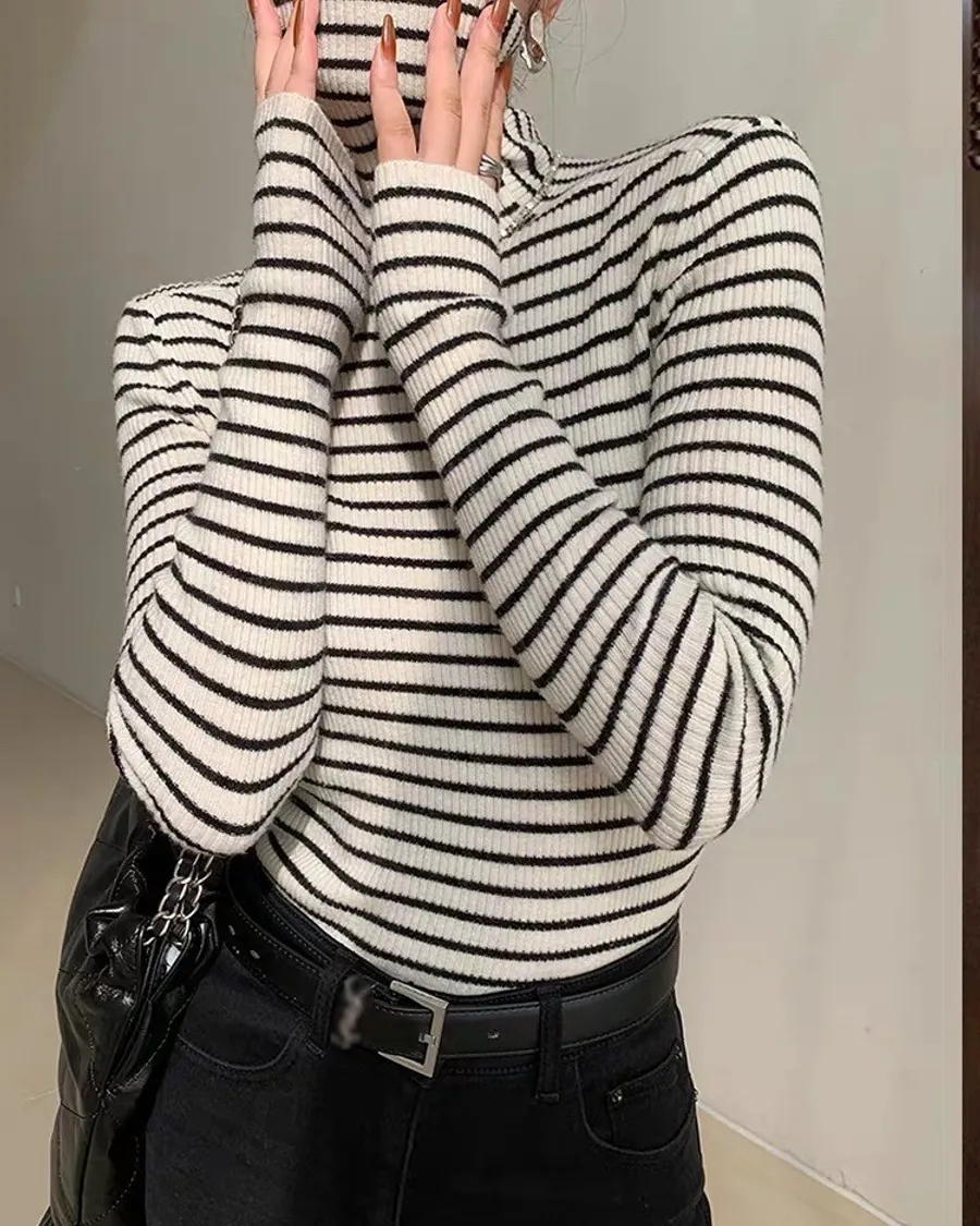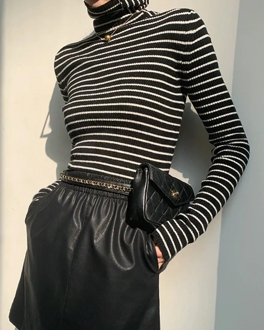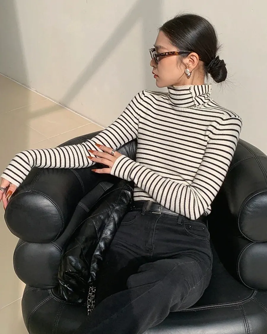 黑白彈性直條紋高領上衣