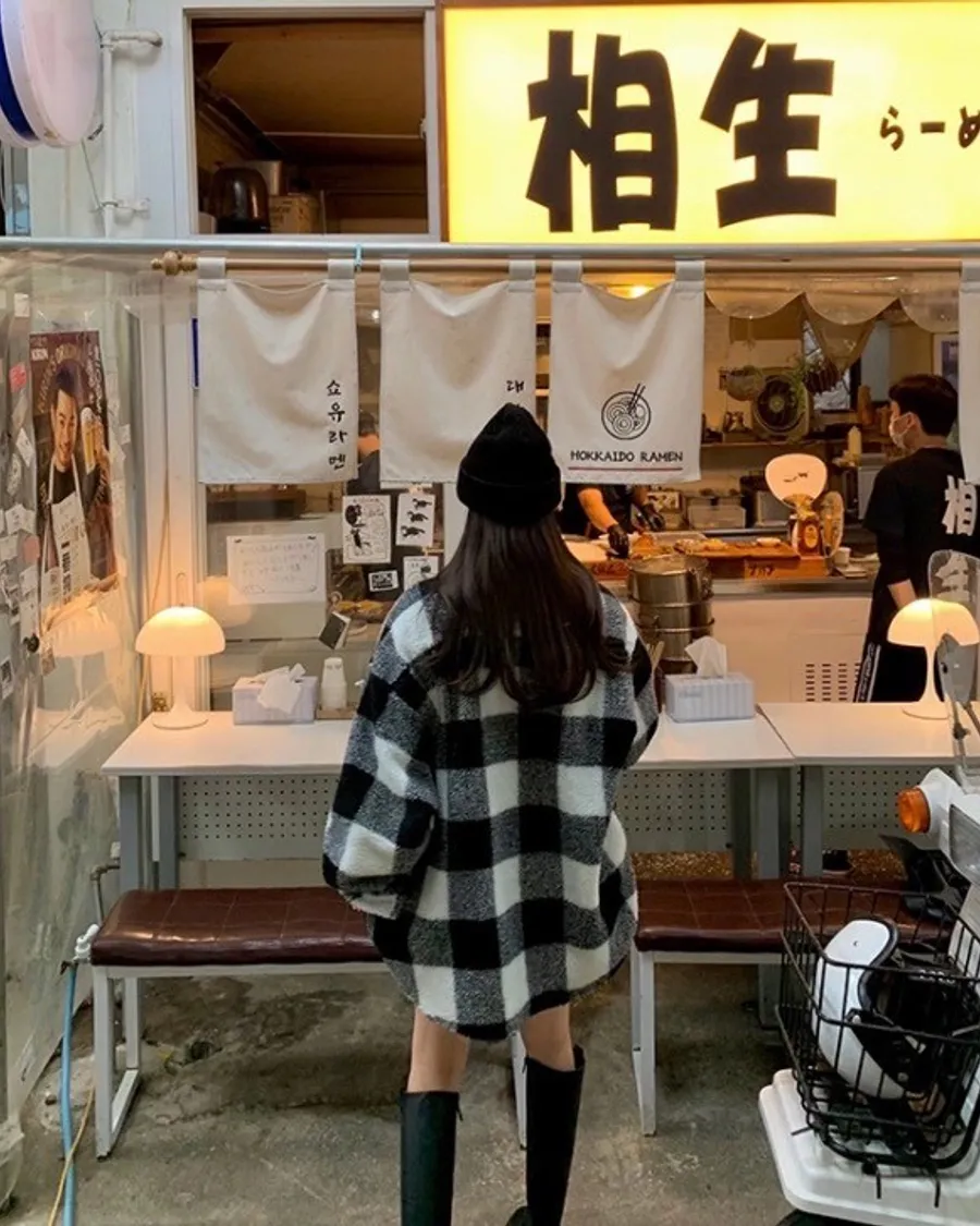 韓版羊羔毛翻領格子外套