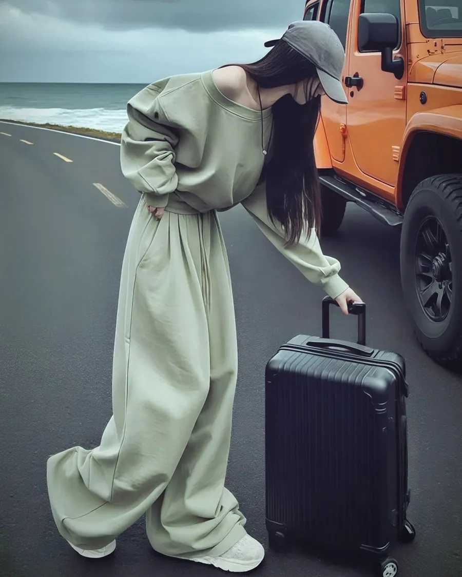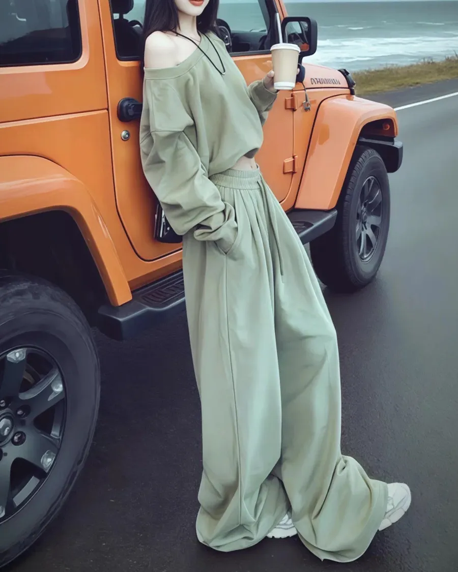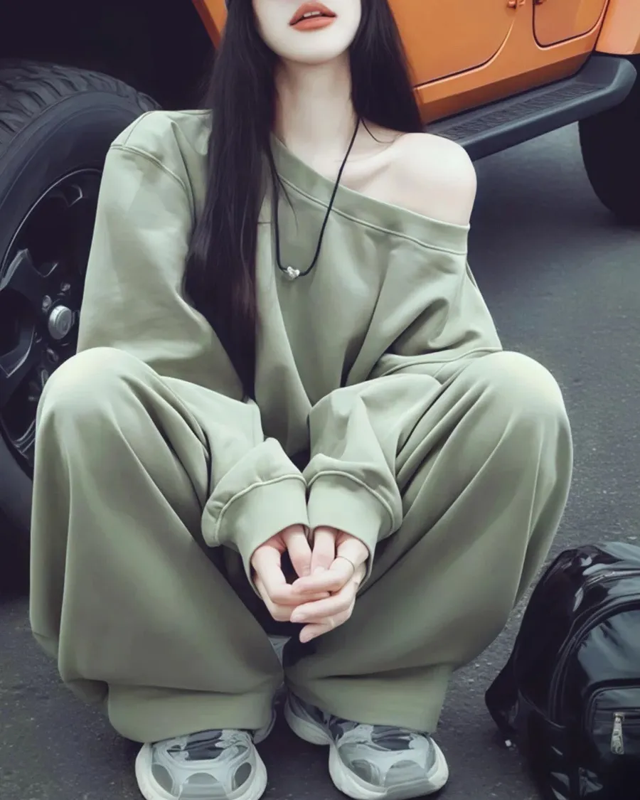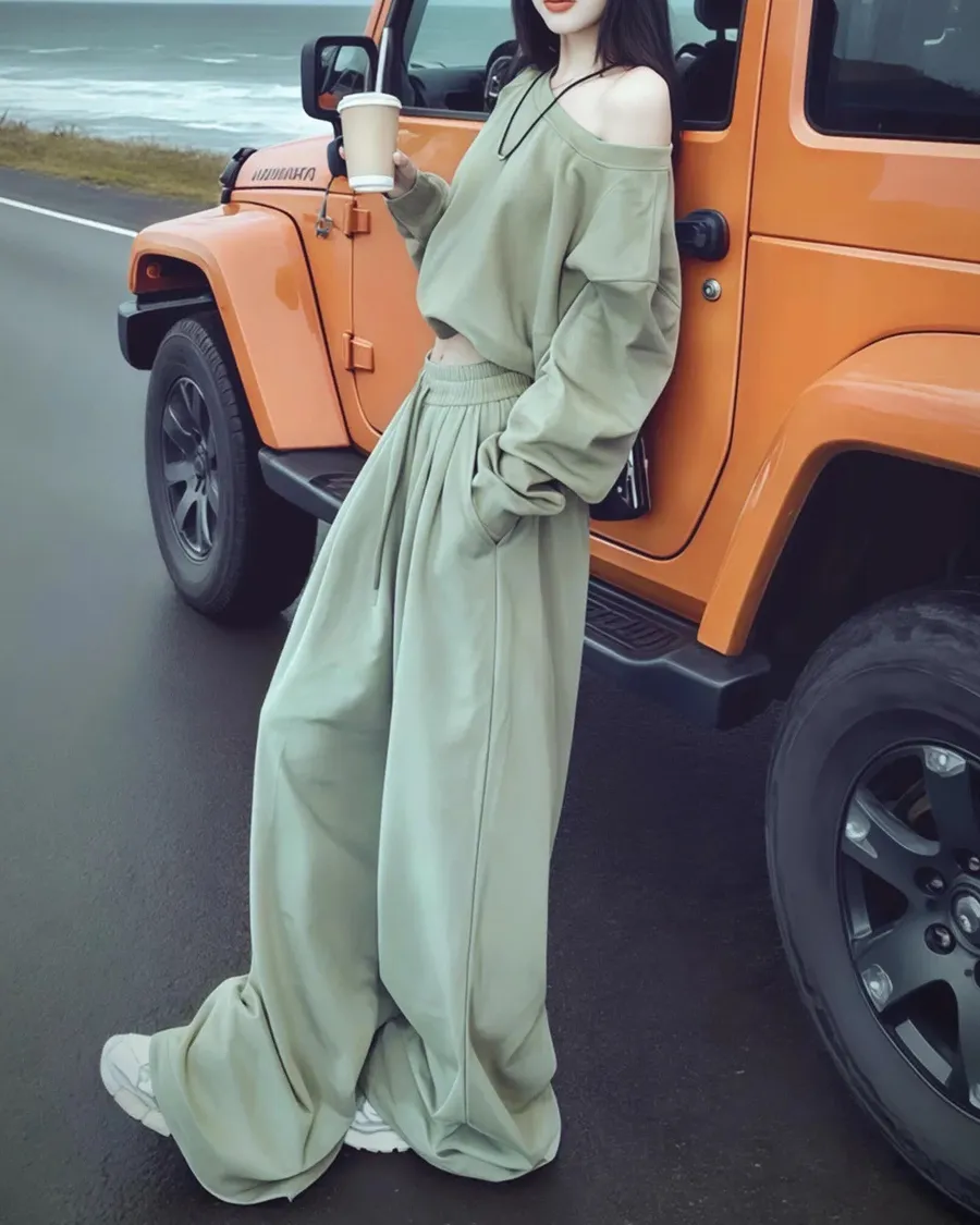 斜肩慵懶高級感休閒運動兩件套裝